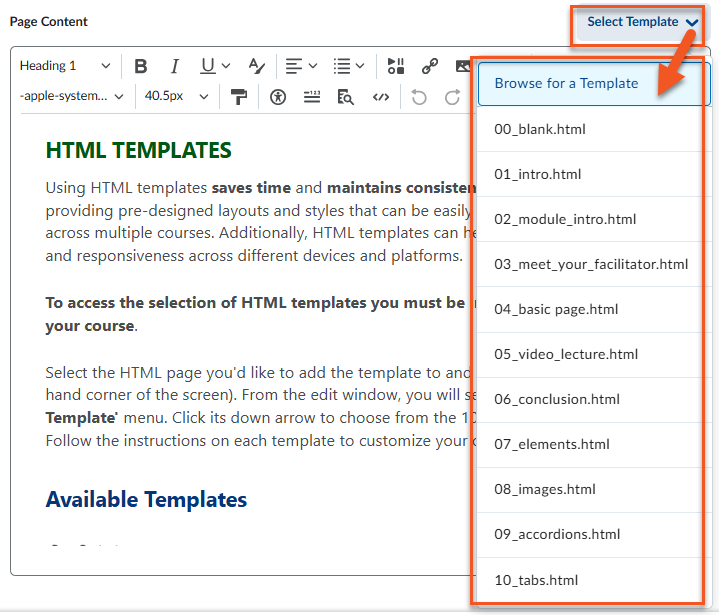Select the HTML page you’d like to add the template to and click edit (3 dots in right-hand corner of the screen). From the edit window, you will see the blue ‘Select Template’ menu. Click its down arrow to choose from the 10 available templates. Follow the instructions on each template to customize your content.
