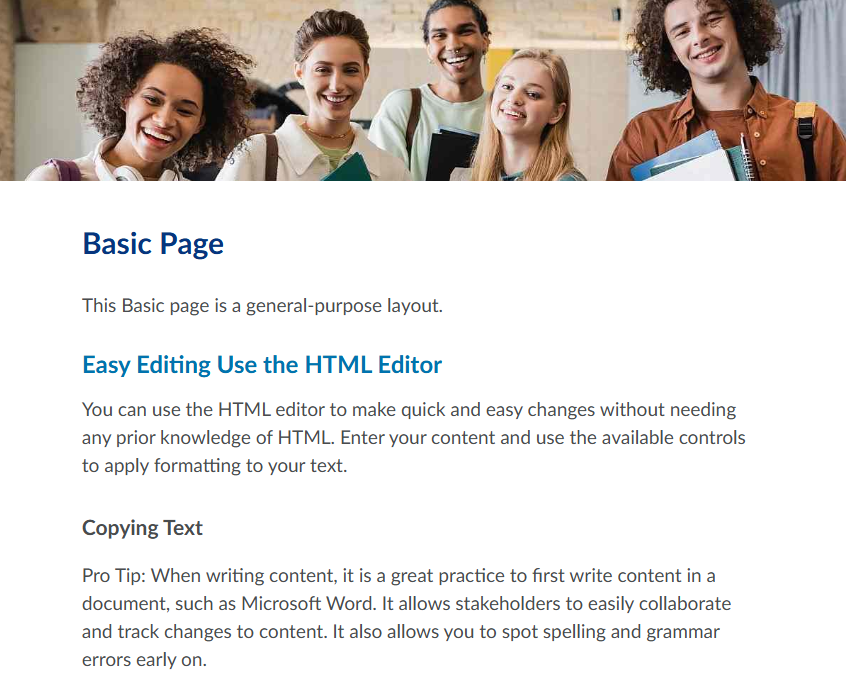 Example of the Basic Page HTML template below. It includes a banner image across the top, a main heading, a sub-heading and instructions on copying and pasting text.