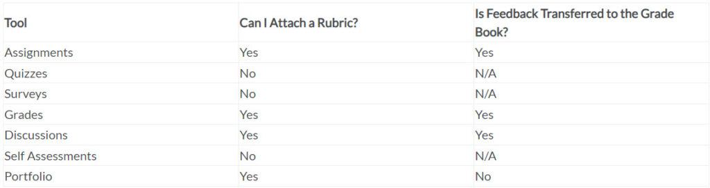 Below is a chart of where rubrics can and cannot be attached in Brightspace.