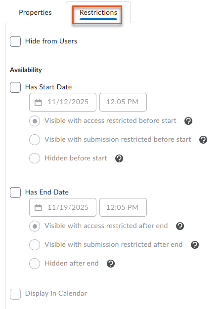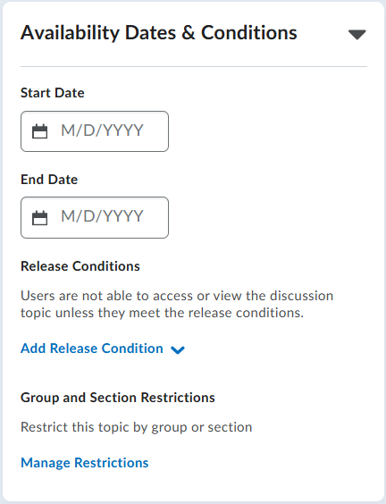 Start and End Dates: Auto­mate when stu­dents can access a dis­cus­sion. If you set a Start Date and time, stu­dents won’t be able to access the dis­cus­sion until that date and time. If no Start Date is set, the dis­cus­sion is avail­able as soon as it’s cre­at­ed and made vis­i­ble.