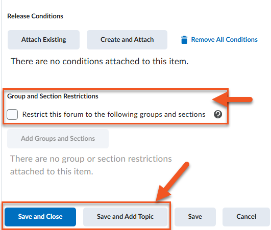 1. Click on the Restric­tions tab to restrict the forum’s avail­abil­i­ty dates, release con­di­tions or group and sec­tion access.