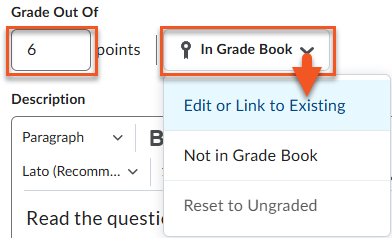 1. To make this a grad­ed dis­cus­sion top­ic click on Grade Out Of and enter the num­ber of points. Click the In Grade book drop-down menu and choose to cre­ate a new grade item or link to an exist­ing grade item.