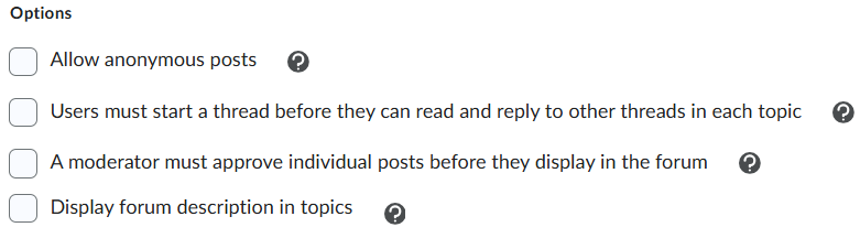 • Require stu­dents to cre­ate their own thread in a dis­cus­sion top­ic before they can view or respond to threads start­ed by oth­ers. If this set­ting is enabled at the forum lev­el, it will auto­mat­i­cal­ly apply to all dis­cus­sion top­ics assigned to that forum.