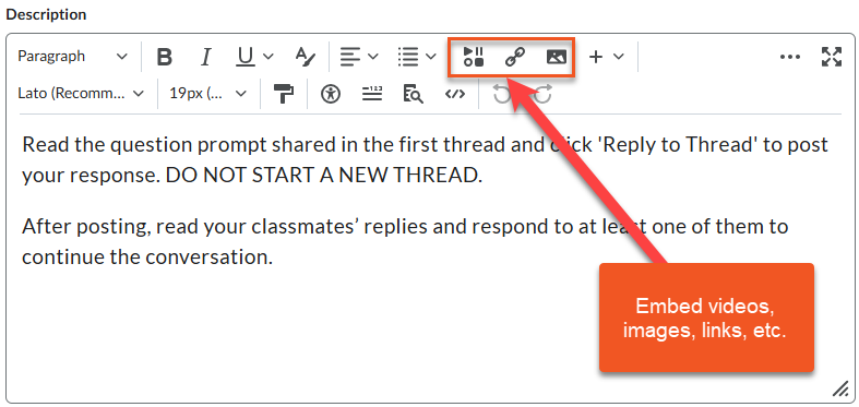 • Thread: The first com­ment with­in a top­ic begins a thread. Stu­dents and instruc­tors can cre­ate new threads under each top­ic.