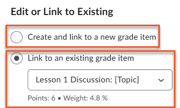NOTE: If you’ve already built out your grade­book with grade items, do not cre­ate and link to a new grade item or you will end up with dupli­cate grade items in your grade­book.