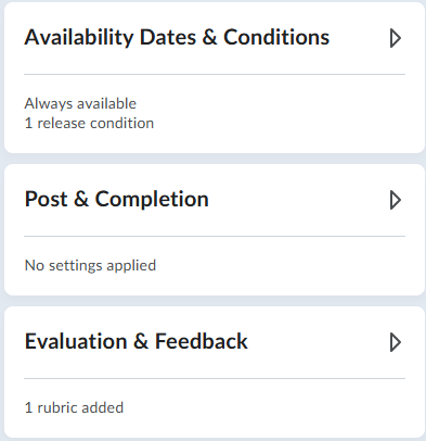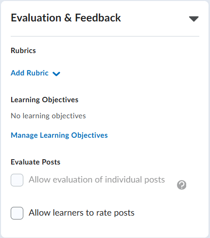 1. Add Dates & Con­di­tions, enter Posts & Com­ple­tion para­me­ters, and select Eval­u­a­tion & Feed­back set­tings. See Set­ting Dis­cus­sion Top­ic Para­me­ters for more details.