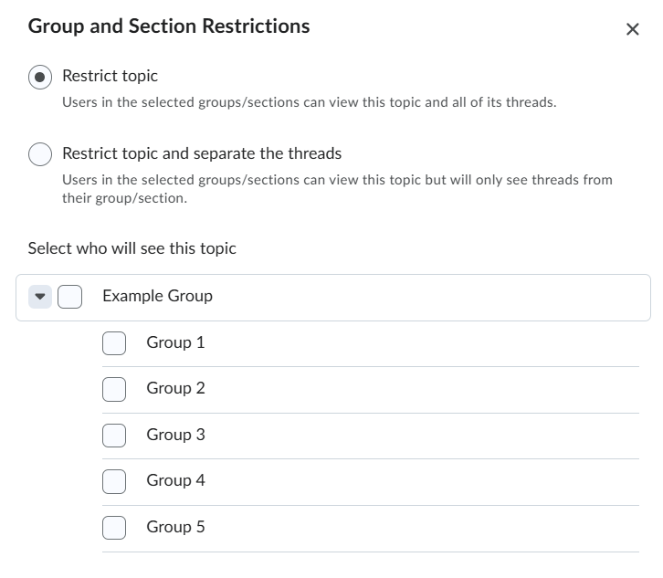Restrict a dis­cus­sion top­ic so that only groups or sec­tions select­ed will be able to see and post to it.