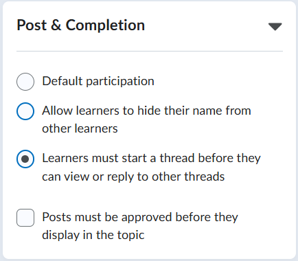 Posts & Com­ple­tion options let you con­trol how stu­dents par­tic­i­pate in a dis­cus­sion. You can:
