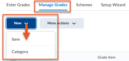 - Create a new grade item or category by clicking on New > Item (or Category)