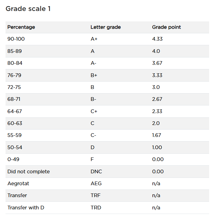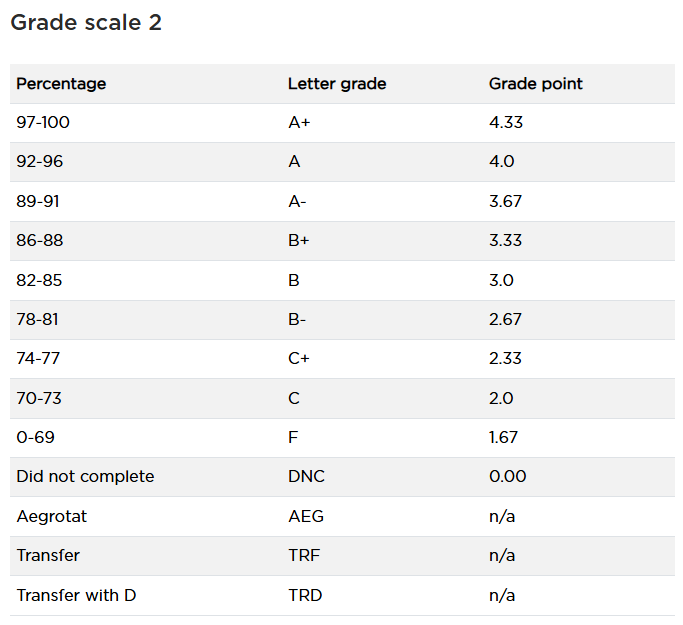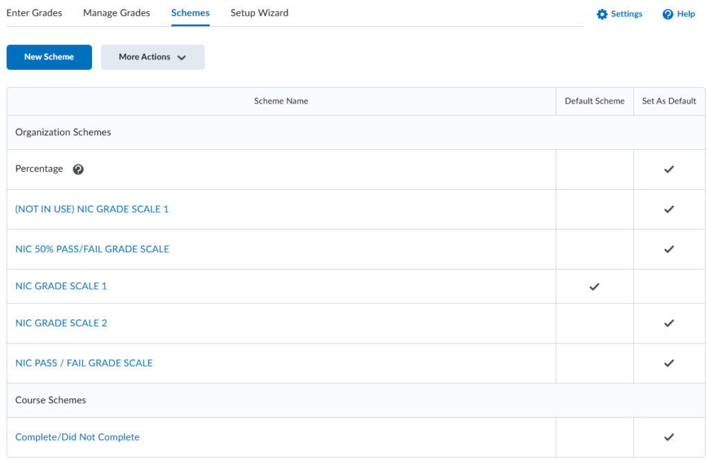 Open the accordions below to learn more about the four grading views in Brightspace and available grade NIC grade schemes.