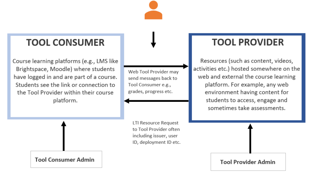 Integrations, extensions, plugins, cartridges, and online textbook links are terms used by third-party providers (such as publishers, web platforms, and social media companies) to describe how their products connect with an institution’s learning management system (LMS). These connections typically use the Learning Tools Interoperability (LTI) standard, allowing users to access external content or tools from within the LMS without re-entering login credentials.