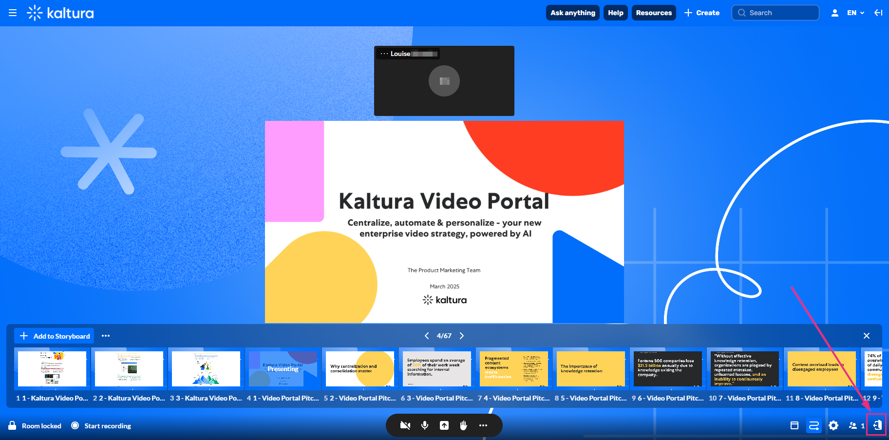 For more detailed information visit the Stage Management in a Kaltura Room webpage on the Kaltura Knowledge Center site or view this PDF.