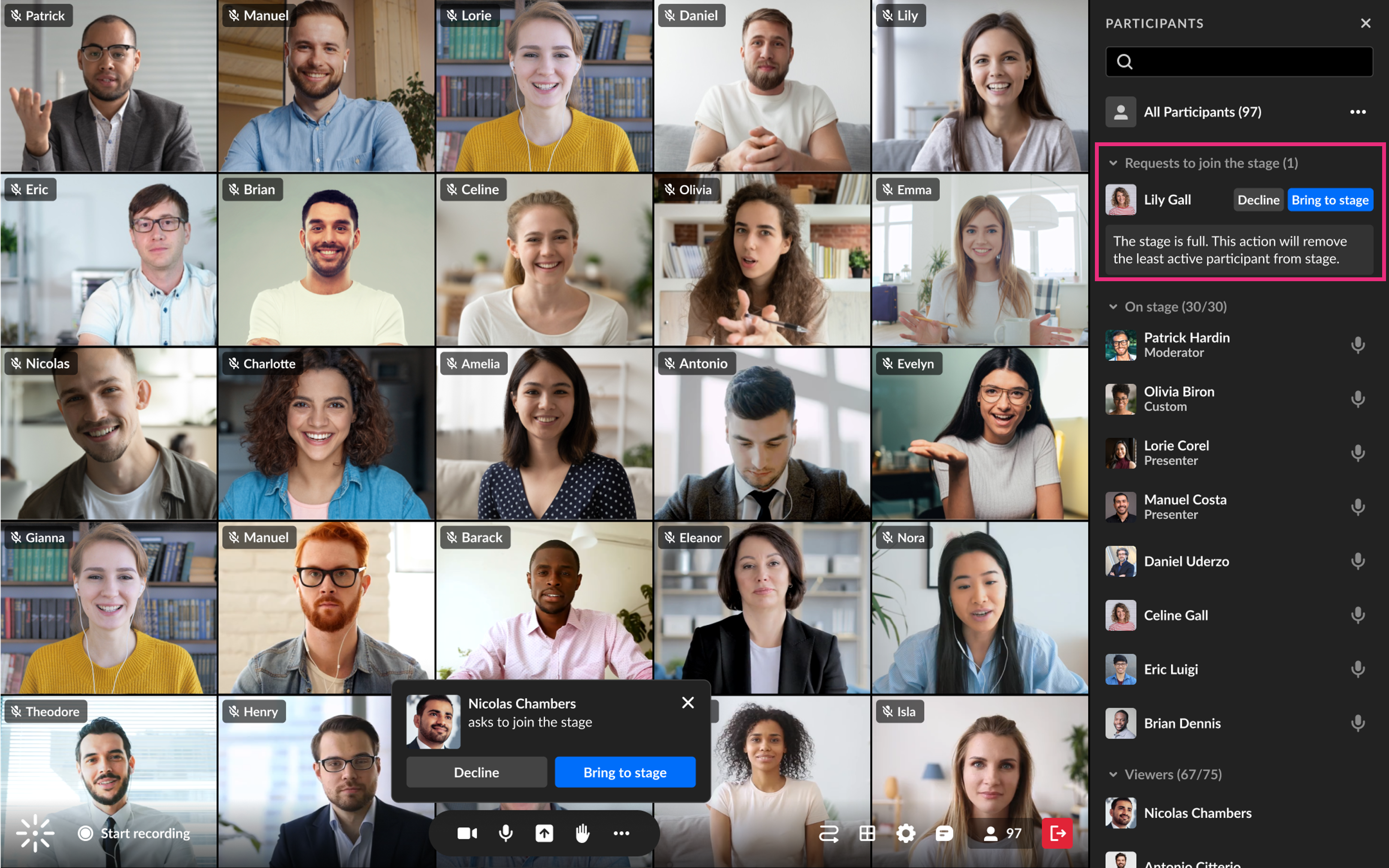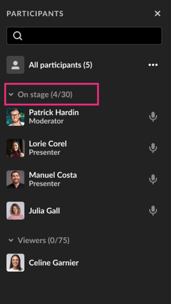 The number of people on the stage is monitored automatically, and the moderator can see this number in the participants list.