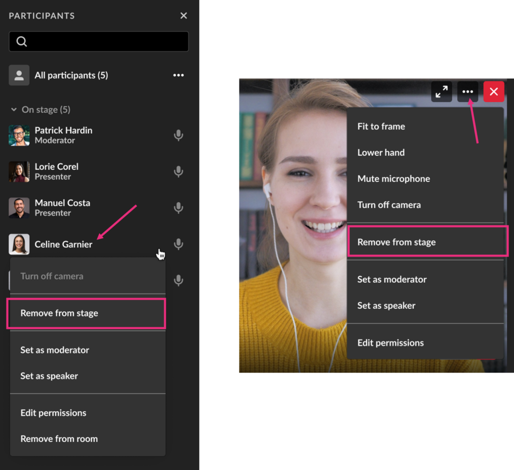 Yes. Moderators can return a participant to viewer status by clicking on their name in the participants list and selecting Remove from stage or by hovering over their thumbnail and clicking the three dots menu, then selecting Remove from stage.