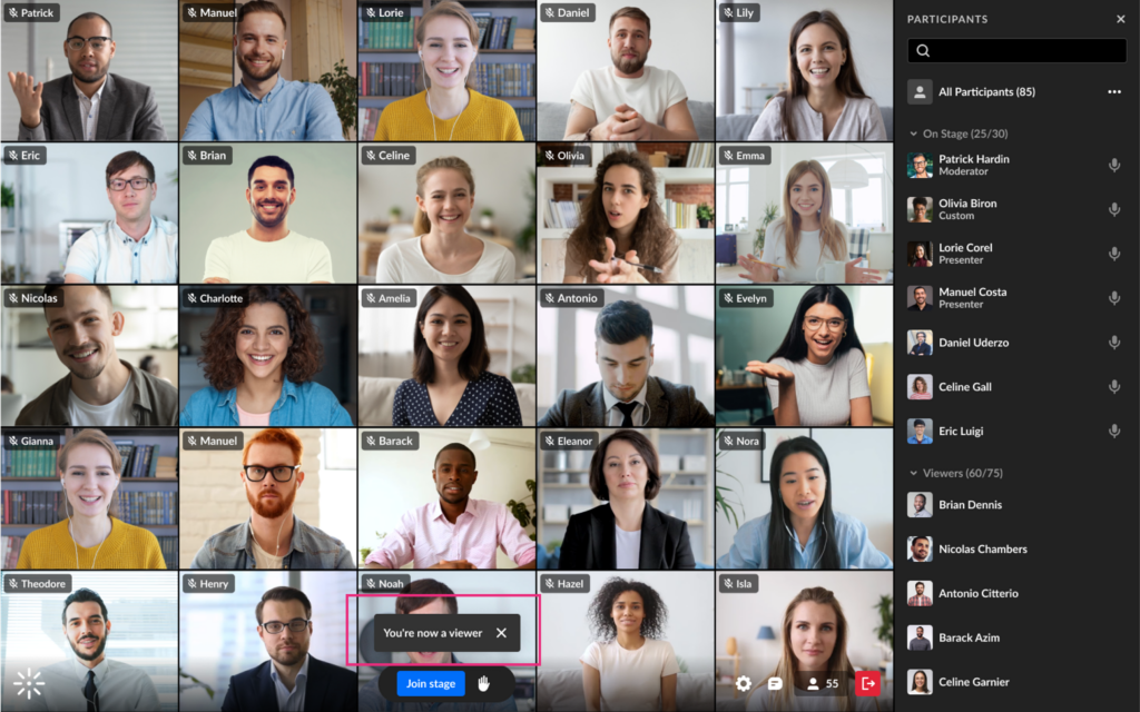 If the stage reaches maximum capacity, the last active speaker (the user that hasn’t spoken for the longest time) will be removed from the stage, making room for the new participant. The speaker who is removed can always go back on stage by clicking Join stage.
