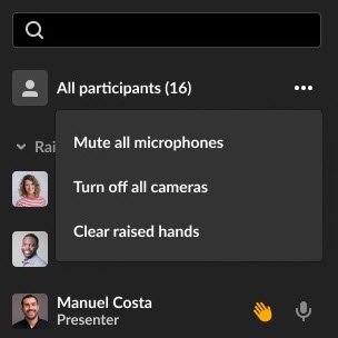 - Turn off camera - Turns off the participant’s camera.