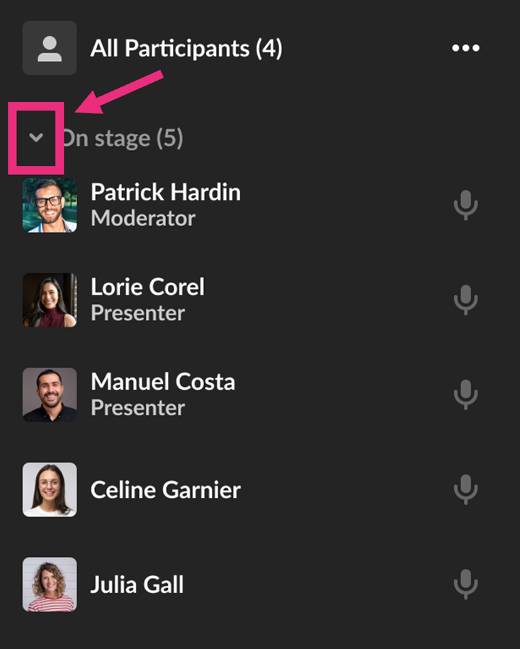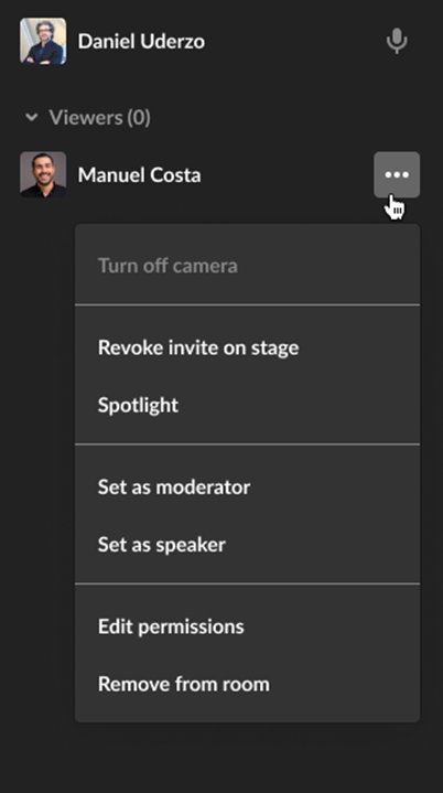 NOTE: Clicking the three-dot menu next to your own name gives you options to Turn off camera if on stage, and Join stage/Remove from stage.